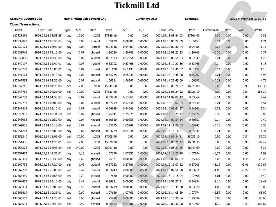 戶口號碼及戶口持有人姓名在 statement 的第一宗交易左上角, 右上角顯示今天的日期及列印時間, 中間顯示 Currency : USD, 圖表及數據分析, 由證券商 Tickmill 的系統從交易數據中自動計算出來, 顯示 Deposit / Withdrawal since launched, Total Net Profit, Maximal Drawdown, Profit Factor, Total Trades, Profit Trades, … 此外, 每宗交易由證券商直接傳送到國際認可的程式交易審核機構 myfxbook.com 進行真倉審核及回報分析 (以下圖表對上 Track Record 及 Trading Privileges 綠色圓圈, 內有白色 tick)