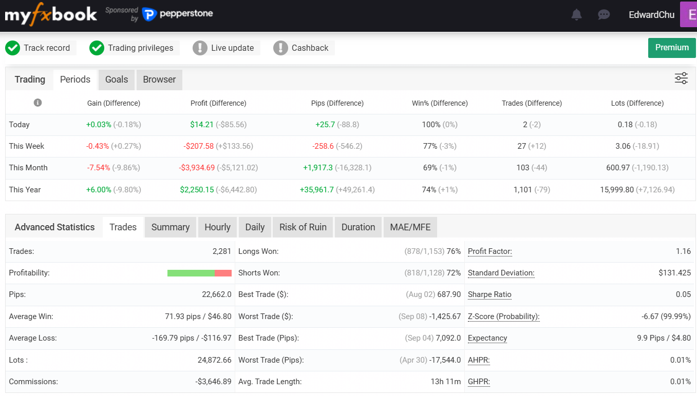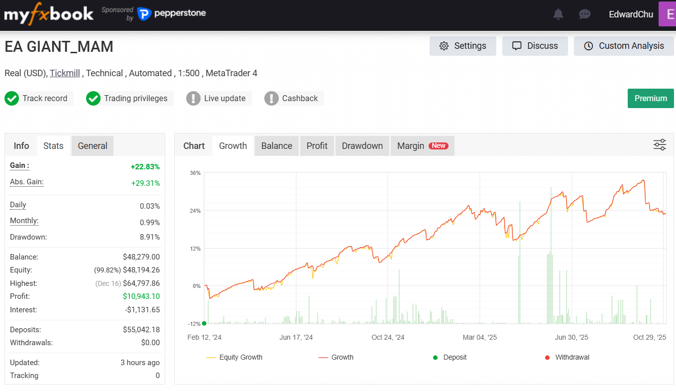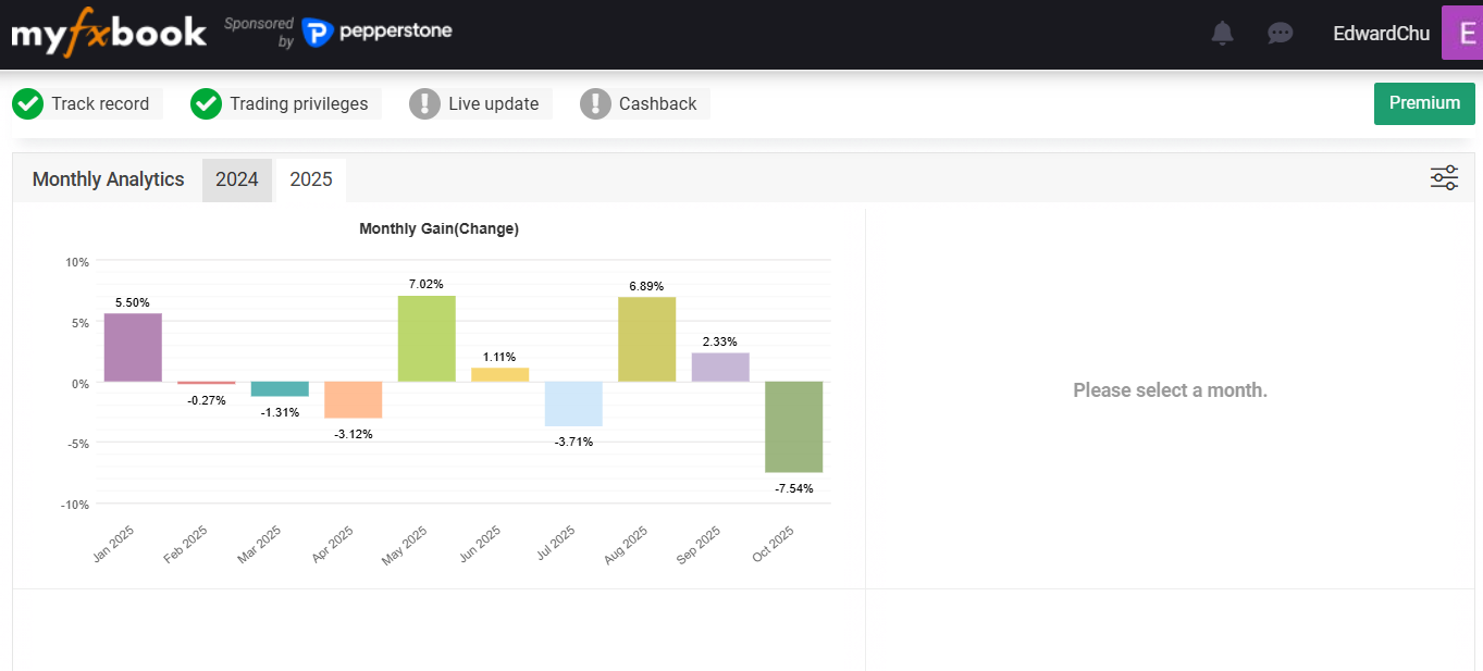 跟單服務 (Copy Trading) “保守型” , 由 2024年2月13日開始第一宗交易至 2025年10月31日, 合共 2281 宗交易, Max. Drawdown = 8.91%, 每位參加者, 20 個月回報為 22.83%, 已授權全球公認為最公平和權威的第三方績效驗證網站 myfxbook 進行回報分析, 審核 “跟單服務” 的每宗交易