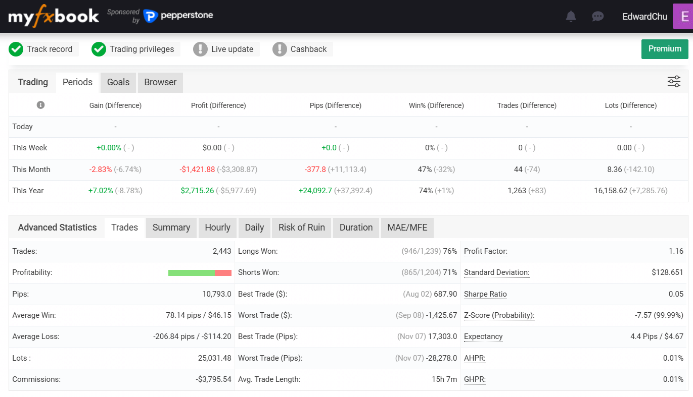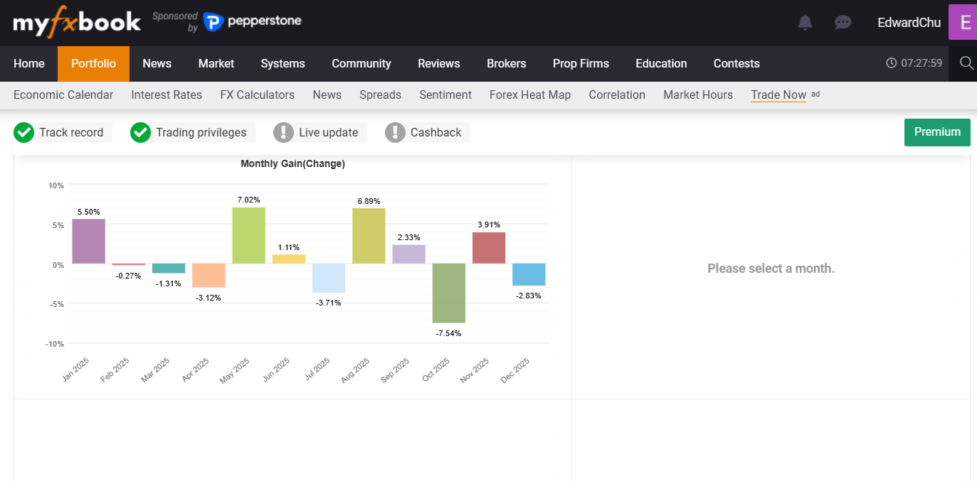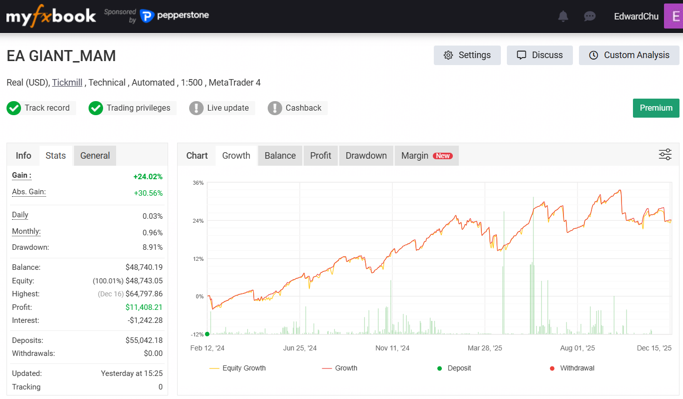 跟單服務 (Copy Trading) “保守型” , 由 2024年2月13日開始第一宗交易至 2025年12月30日, 合共 2443 宗交易, Max. Drawdown = 8.91%, 每位參加者, 22個月回報為 24.02%, 已授權全球公認為最公平和權威的第三方績效驗證網站 myfxbook 進行回報分析, 審核 “跟單服務” 的每宗交易