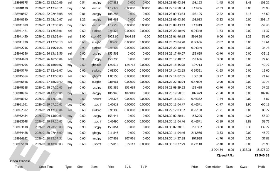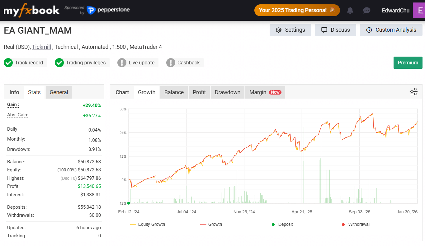 跟單服務 (Copy Trading) “保守型” , 由 2024年2月13日開始第一宗交易至 2026年1月31日, 合共 2536 宗交易, Max. Drawdown = 8.91%, 每位參加者, 23個月回報為 29.40%, 已授權全球公認為最公平和權威的第三方績效驗證網站 myfxbook 進行回報分析, 審核 “跟單服務” 的每宗交易